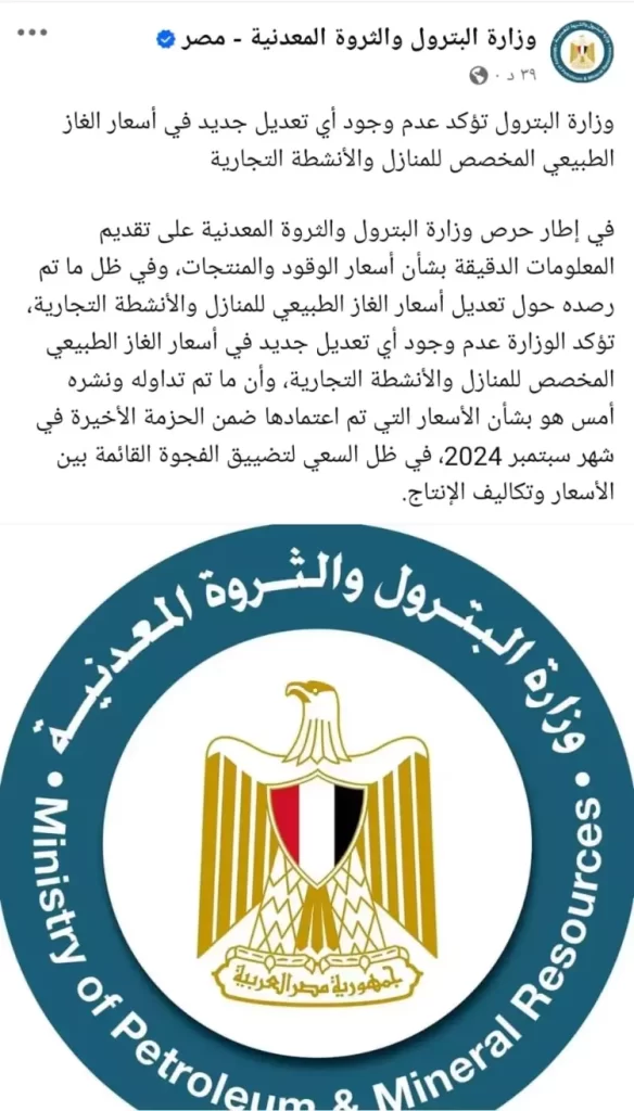 لذلك حرصت وزارة البترول على بيان حقيقة الزيادة فقد أكدت في بيان اليوم الإثنين على عدم وجود أي تعديل جديد في أسعار الغاز الطبيعي سواء المخصص للمنازل أو الأنشطة التجارية.